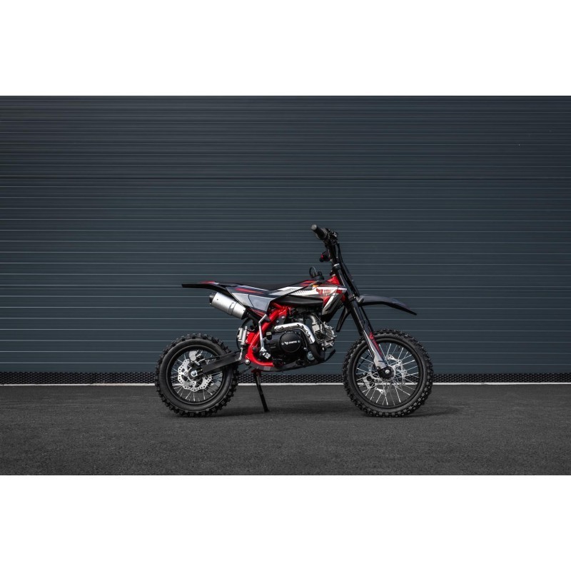 Dětská benzínová motorka pitbike Leramotors Cannon 125ccm 4T 14/12 E-Start s motorem o objemu 125 ccm a výkonem 8 kW poskytuje ideální kombinaci síly a spolehlivosti jak pro zkušenější zapálené bikery, tak i pro začínající motorkáře. Jednoválcový, 4-taktní motor je chlazen vzduchem, což zajišťuje efektivní provoz i v náročnějších podmínkách. Díky nožnímu i elektrickému startování je motorka snadno ovladatelná, ať už v terénu, nebo při klidné jízdě. Elektronické zapalování C.D.I. zajišťuje rychlý start a stabilní provoz.