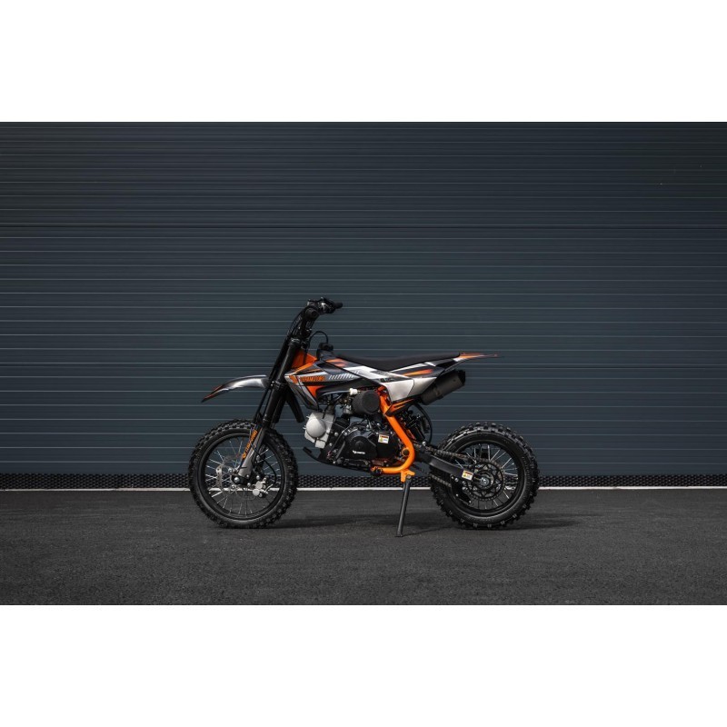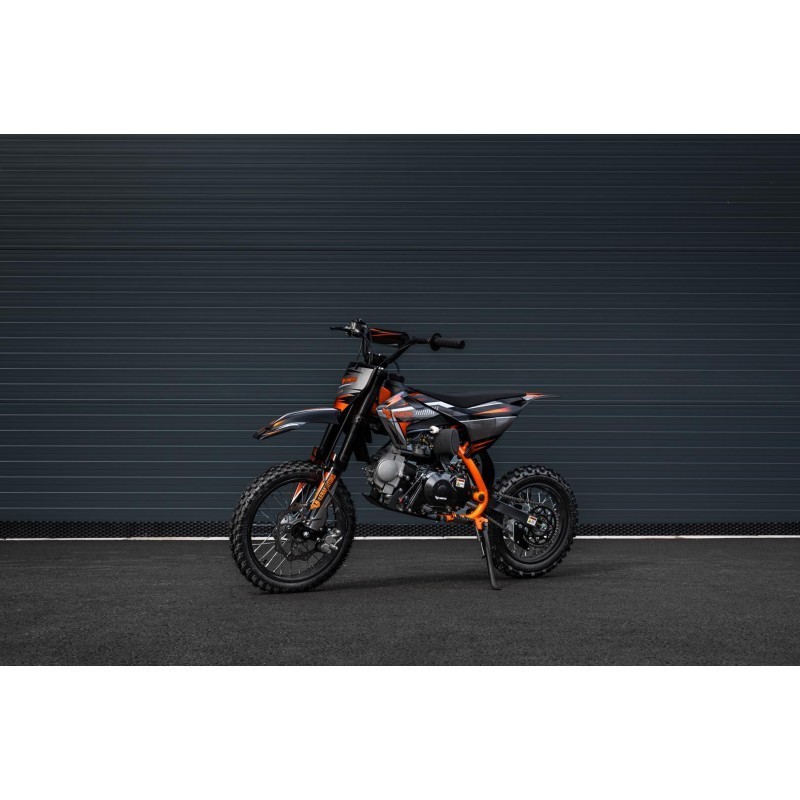Dětská benzínová motorka pitbike Leramotors Cannon 125ccm 4T 14/12 E-Start s motorem o objemu 125 ccm a výkonem 8 kW poskytuje ideální kombinaci síly a spolehlivosti jak pro zkušenější zapálené bikery, tak i pro začínající motorkáře. Jednoválcový, 4-taktní motor je chlazen vzduchem, což zajišťuje efektivní provoz i v náročnějších podmínkách. Díky nožnímu i elektrickému startování je motorka snadno ovladatelná, ať už v terénu, nebo při klidné jízdě. Elektronické zapalování C.D.I. zajišťuje rychlý start a stabilní provoz.