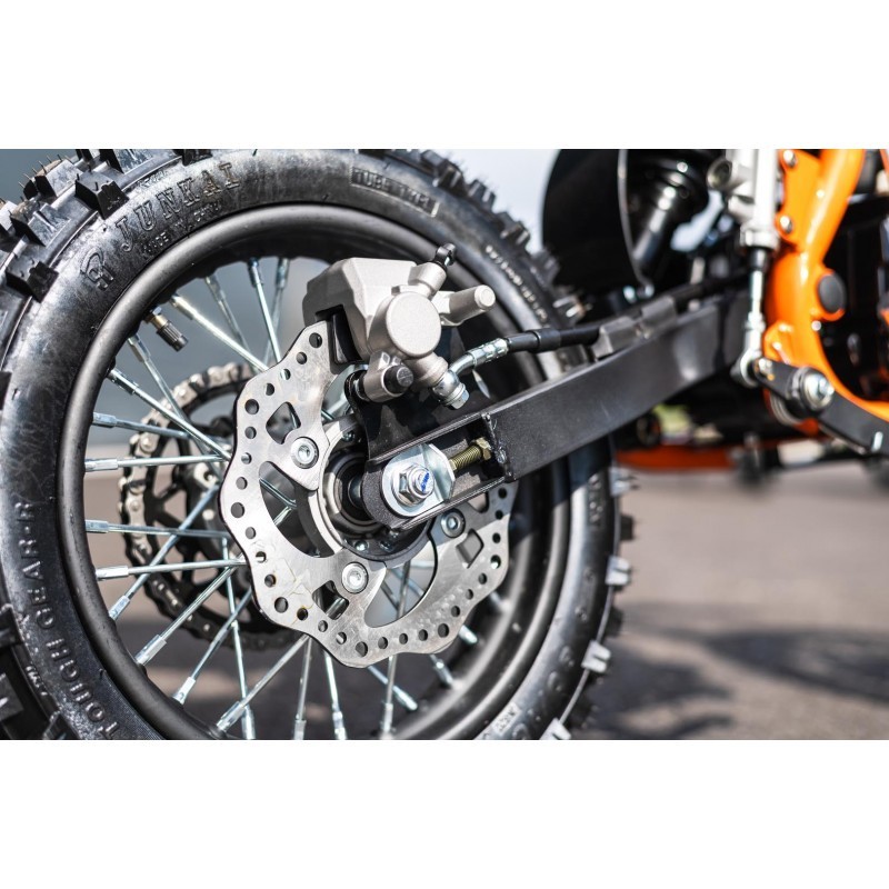 Pitbike Leramotors Cannon 125ccm 4T 14/12 E-Start je vybaven kvalitními hydraulickými kotoučovými brzdami, které zajišťují spolehlivý a bezpečný výkon i v náročných podmínkách. Přední i zadní kotoučové brzdy jsou ovládány hydraulickým systémem, což zajišťuje plynulý a konzistentní brzdný účinek i při vysokých rychlostech, což je zásadní pro bezpečnost při jízdě v terénu. Díky tomu je pitbike snadno ovladatelný a jezdec má jistotu, že motorka spolehlivě zastaví na jakémkoliv povrchu. Tento model poskytuje vysoký stupeň bezpečnosti a kontroly, což ocení začínající i pokročilejší jezdci při každé jízdě.