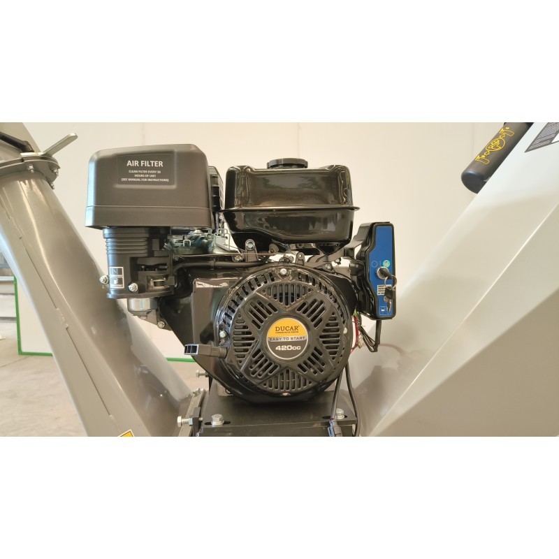 tìpkovaè s jedineènými funkcemi: otoèný výdech o 360°, bezpeènostní pojistka. Pohání ho výkonný ètyøtaktní benzínový motor Ducar DH420 (420cc / 15HP) s 3600 ot/min. Startuje se elektricky nebo reverzním startem s 12V 20Ah olovìnou baterií. Zvládne vìtve a do prùmìru 120mm s dvìma otoènými noi a jednou kovadlinou. Gravitaèní samokrmení, kevlarový øemen, a odstøedivá spojka zajiují plynulý provoz. Vypoutìcí lab je nastavitelný o 360°. Tané zaøízení.16x8,0-7 ATV pneumatiky pro jednoduchý transport. Hmotnost 180kg (netto) / 200kg (brutto), rozmìry 2560x890x1480mm.