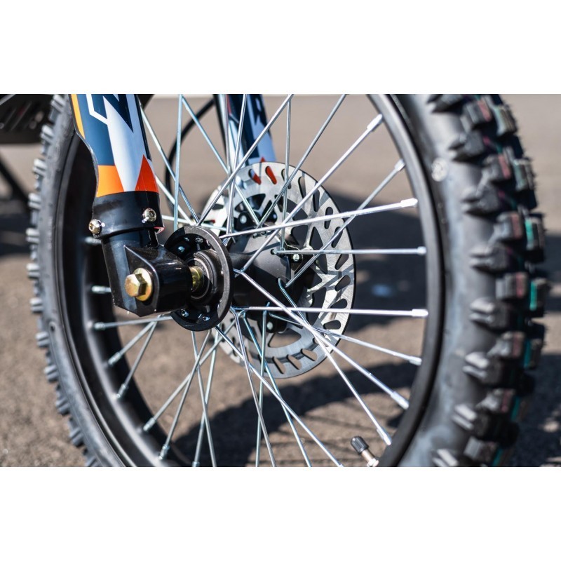 Přední 17" a zadní 14" off-road pneumatiky si hravě poradí s nerovnostmi terénu. A aby byl zážitek z jízdy ještě lepší, získáte v ceně příplatkovou výbavu ZDARMA: přední světlo a ochranné kryty rukou! Tento motocykl s robustním rámem z vysokopevnostní oceli je navržen pro jezdce toužící po adrenalinových dobrodružstvích a skvělém výkonu v terénu.